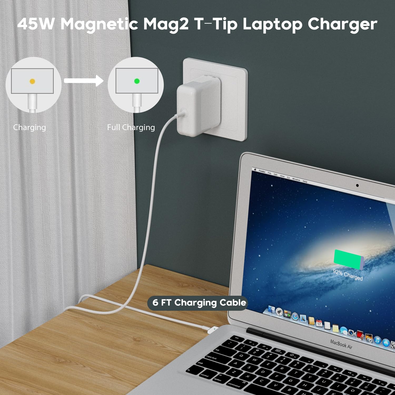 - [LED Status Indicator]:The amber light of this 45W MagSafe 2 Power Adapter means your laptop is charging, while the green light indicates your laptop is fully charged.