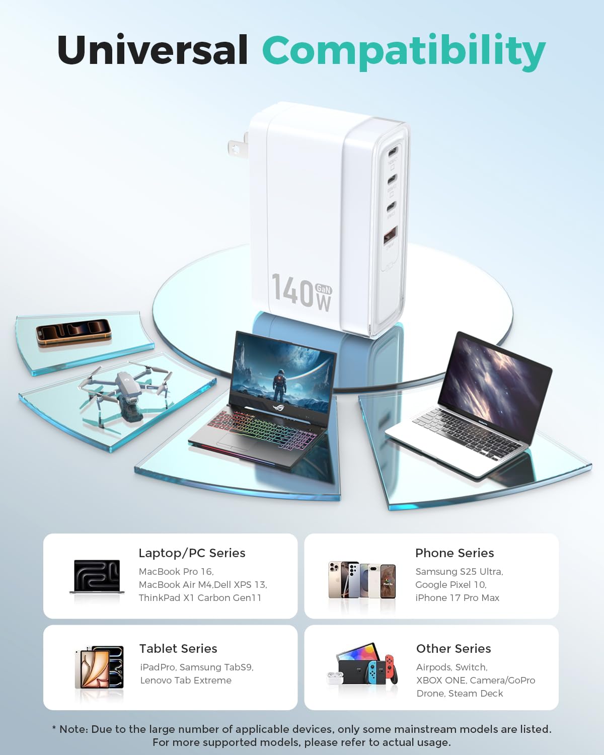 • 4-IN-1 Charger for Travel Essentials: One compact charger effortlessly powers your Laptop (140W/C1), Tablet (100W/C2), Phone (30W/C3), and Accessories (27W/A1). The intelligent chip automatically allocates the optimal wattage when charge them simultaneously,ensuring every device in your lineup gets the fast charge it deserves. Simplify your life and power everything with one.Essentials for travel,office desk,dorm room,nightstand,cruise,RV,camping,vacation,road trip,college