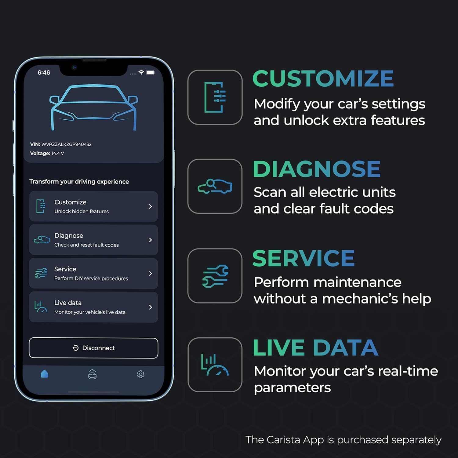 - The All-in-One Car Tool: Diagnostics, access freeze frame data, unlock settings, DIY service, live data. Use all features on any compatible vehicle with a single Carista EVO & App* (sold separately*).