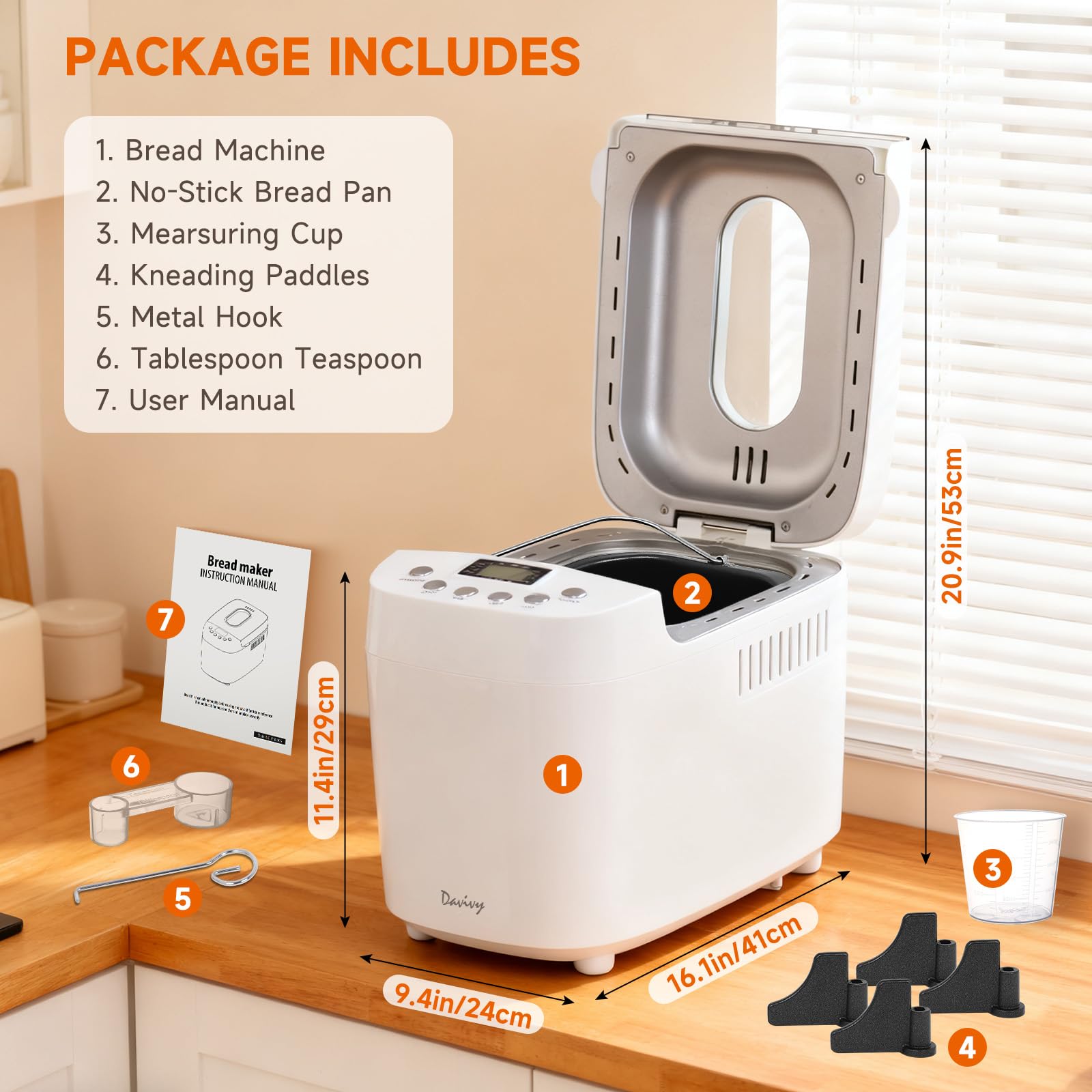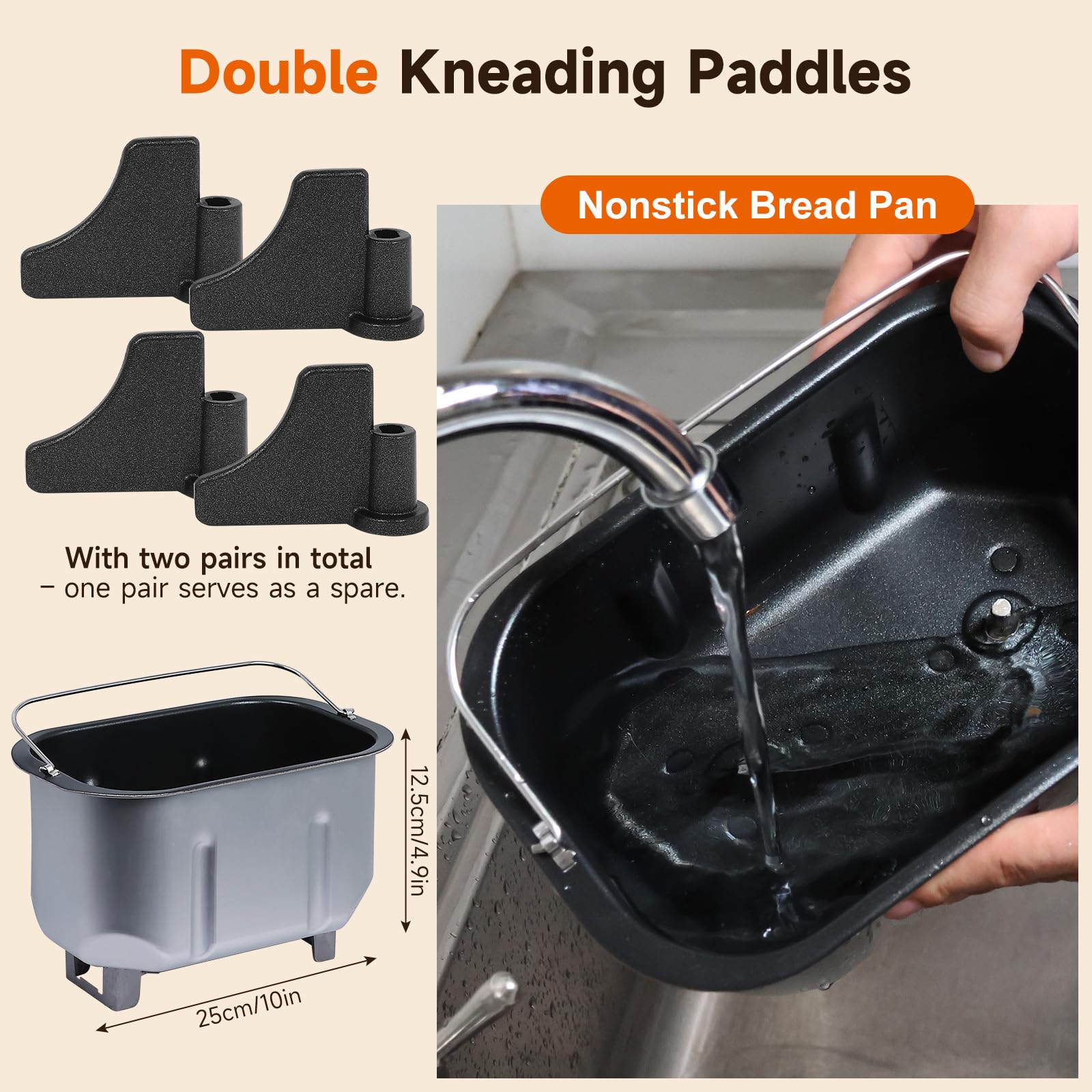 • [What do you get]:3.3LB Bread Machine,2* Dual Dough Kneading Paddle, 1 *Non-stick bread pan, 1 *Measuring cup ,1*Tsp&Tbsp, 1* Metal hook for lifting out kneading paddle, 7 * 24 customer service,30 days no reason to return our bread maker, 1-year warranty.