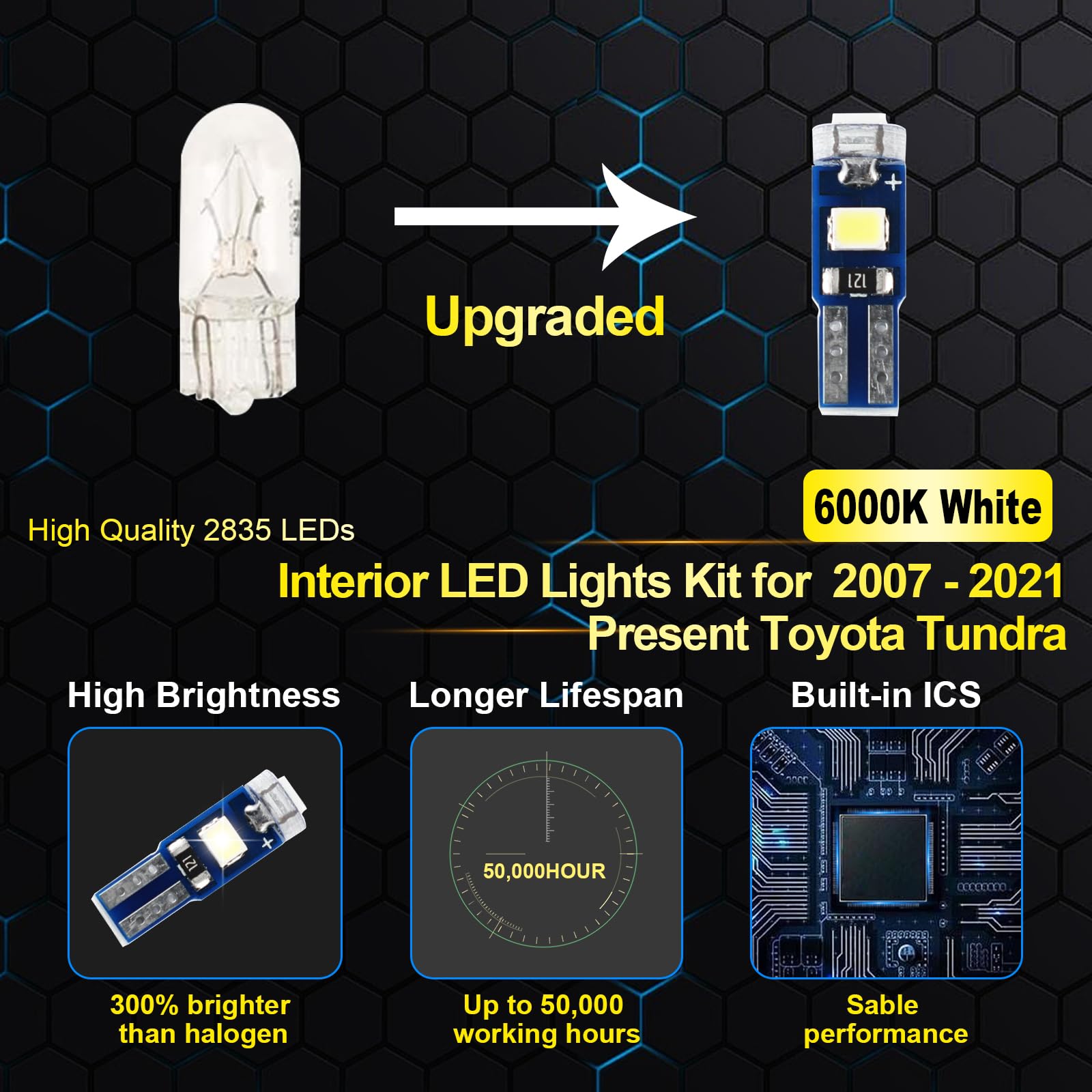 - 【LED Interior Lights】Swap the dull yellow glow for crisp white LEDs, bathing your Tundra’s interior space in a clean, modern light. A Complete LED Interior light kit for 2007-2021 Toyota Tundra (all configurations).