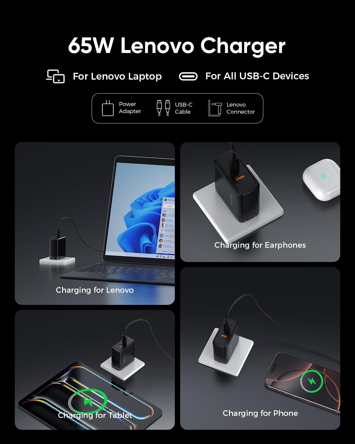 - The Ultimate 2-in-1 Charger: This Lenovo adapter powers your laptop at full 65W speed and charges all your USB-C gear—think iPhone, AirPods, and iPad. One compact charger, no compromises. Streamline your day, anywhere.