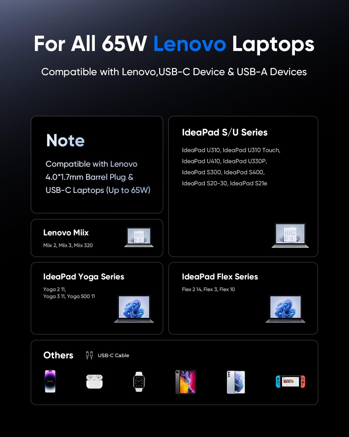 - Broad Lenovo Laptop Compatibility:This 65W charger is specifically designed for Lenovo laptops, compatible with a wide range of models including: the Lenovo Mix series (Mix 2 / Mix 3 / Mix 320); IdeaPad S/U series (U310 / U310 Touch / U410 / U330P / S300 / S400 / S20-30 / S21e); Yoga series (Yoga 2 Tl / Yoga 3 Tl / Yoga 500 Tl); and Flex series (Flex 2 14 / Flex 3 / Flex 10).