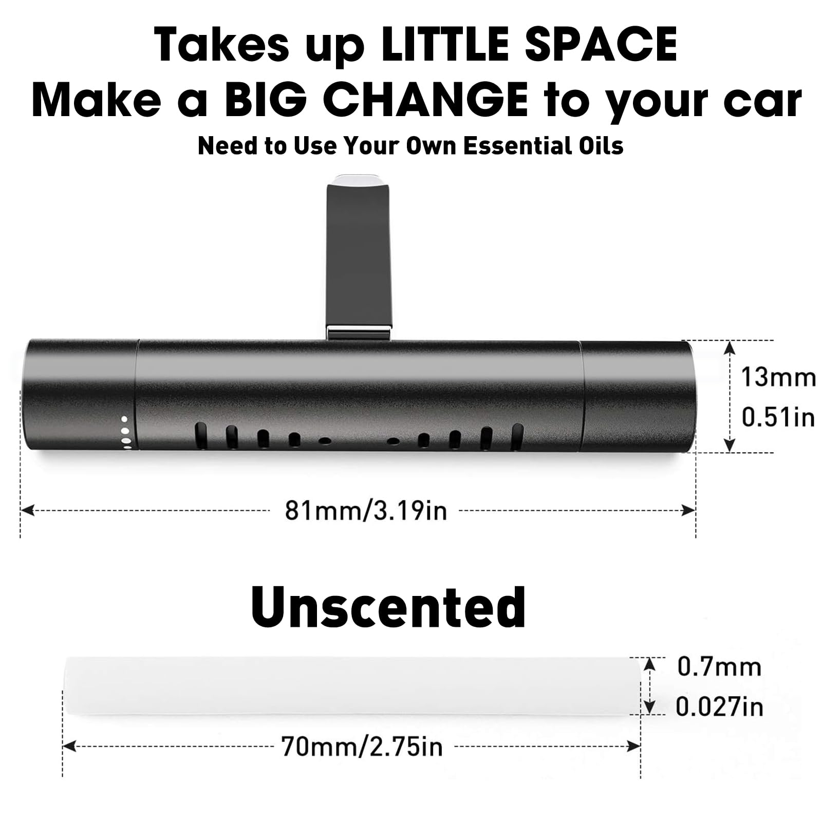 - [More Choice] According to different scent preferences, our car diffuser vent clip has included 12 UNSCENTED refill sticks that absorb and dispense any desired essential oil or perfume with longer lasting fragrance allowing you more aroma choice over your vehicle’s fragrance.