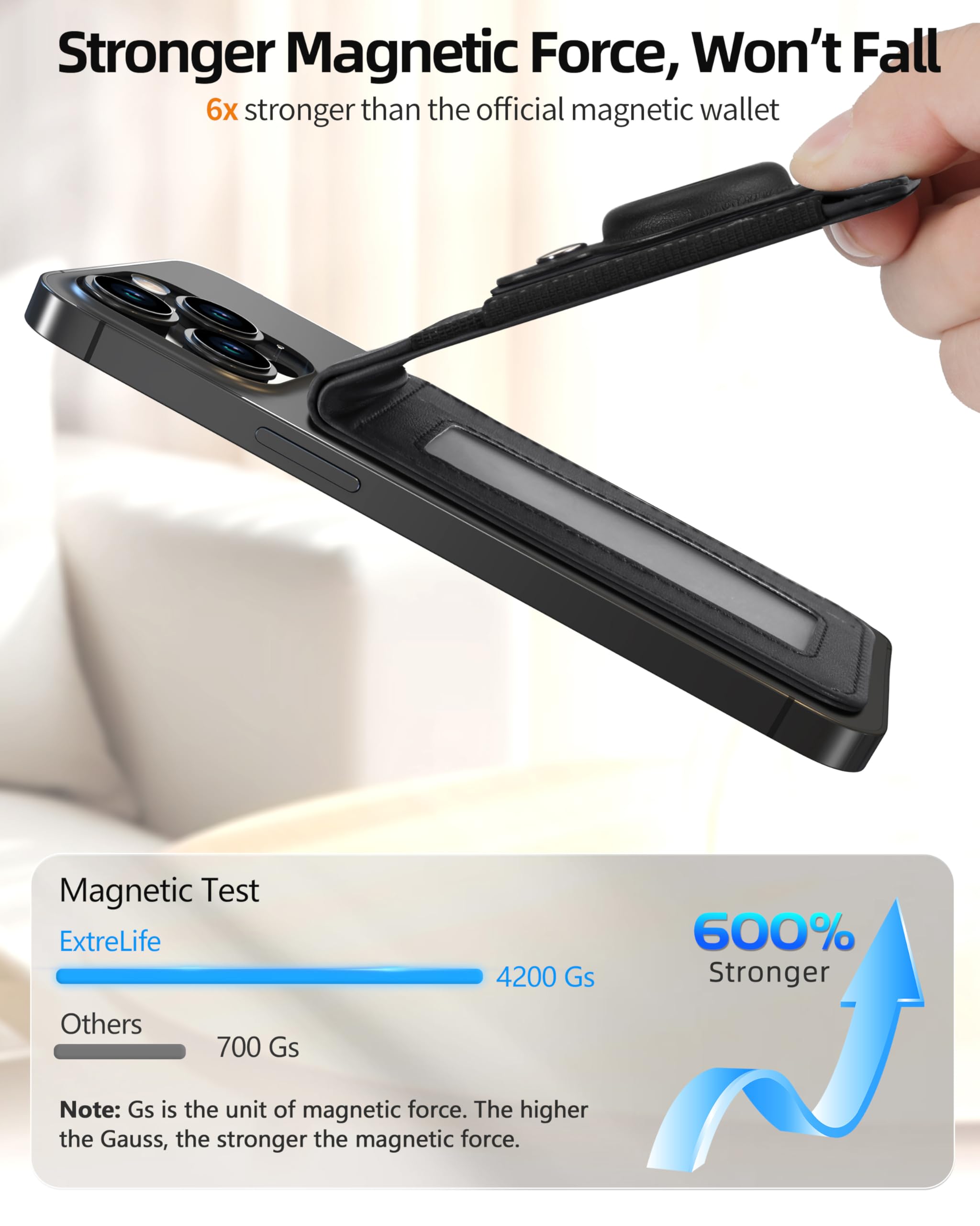 - 【Stronger Magnetic Lock】 The magnetic force for this magsafe wallet stand is up to 4200 Gs, 6x stronger than the official card holder for magsafe wallet, which ensure that your wallet stand stays securely locked on the back of your iPhone, no worry about falling off.