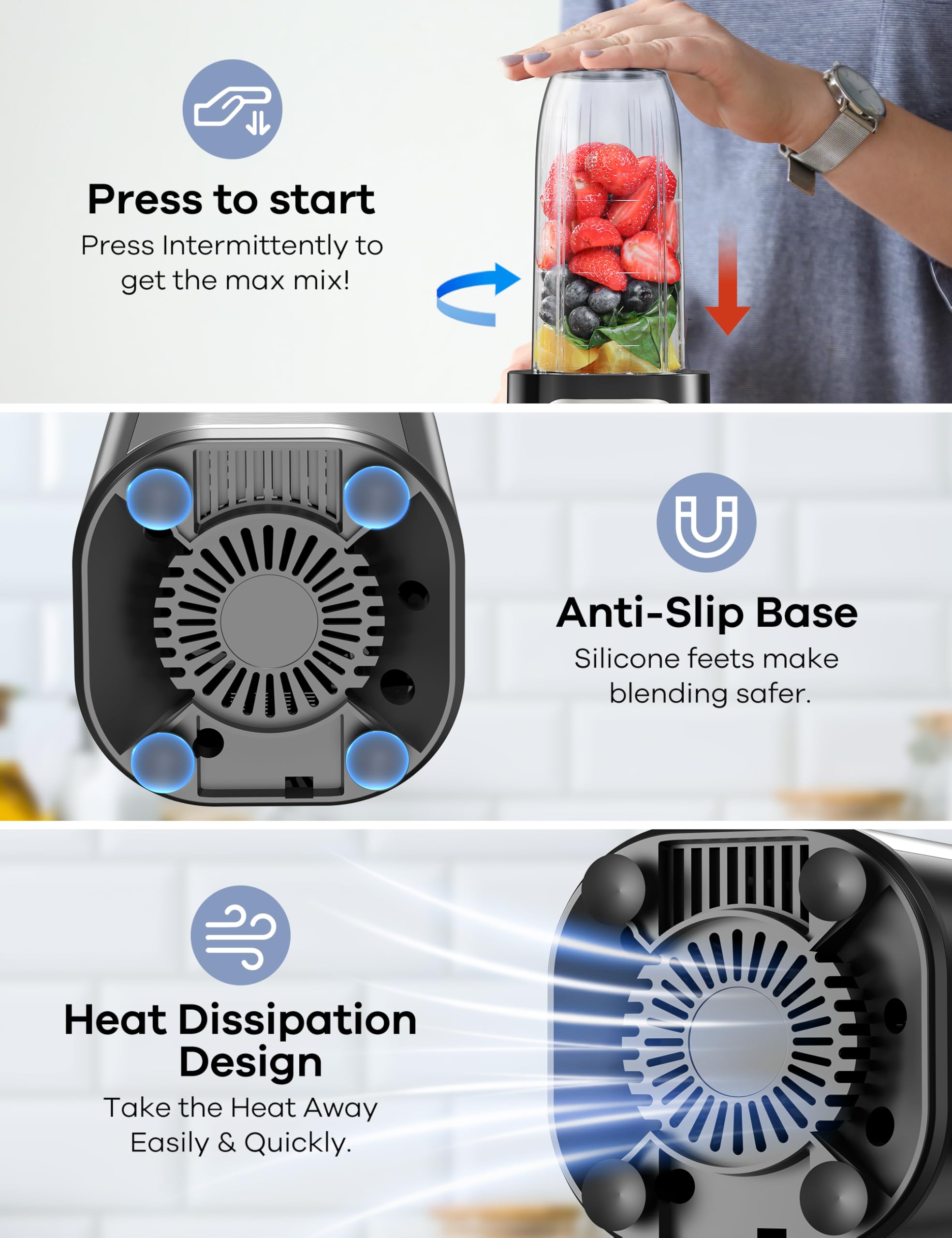 - EASY TO CLEAN: the electric smoothies blender only works when the mixing cup is properly pressed down; Cooling fan on the bottom and the back dissipates heat quickly; Four non-slip silicone pads keep the food blender balanced while working; Cups and lids are dishwasher-safe.