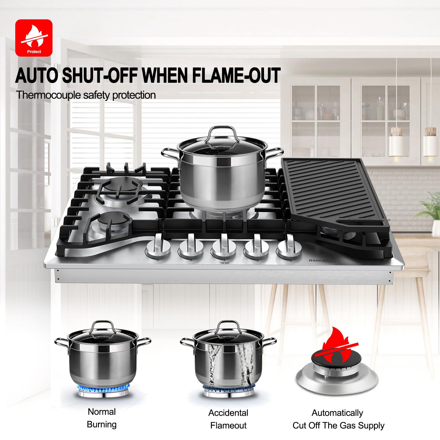 - 【Thermocouple Protection + CSA Certification】This 30 inches NG/LPG gas stove-top is CSA certified for US and Canada use including a CSA certified gas pressure regulator. The thermocouple flame-out failure device system(FFD) will shutoff the gas automatically if a flame is not detected to ensure your safety in an emergency.