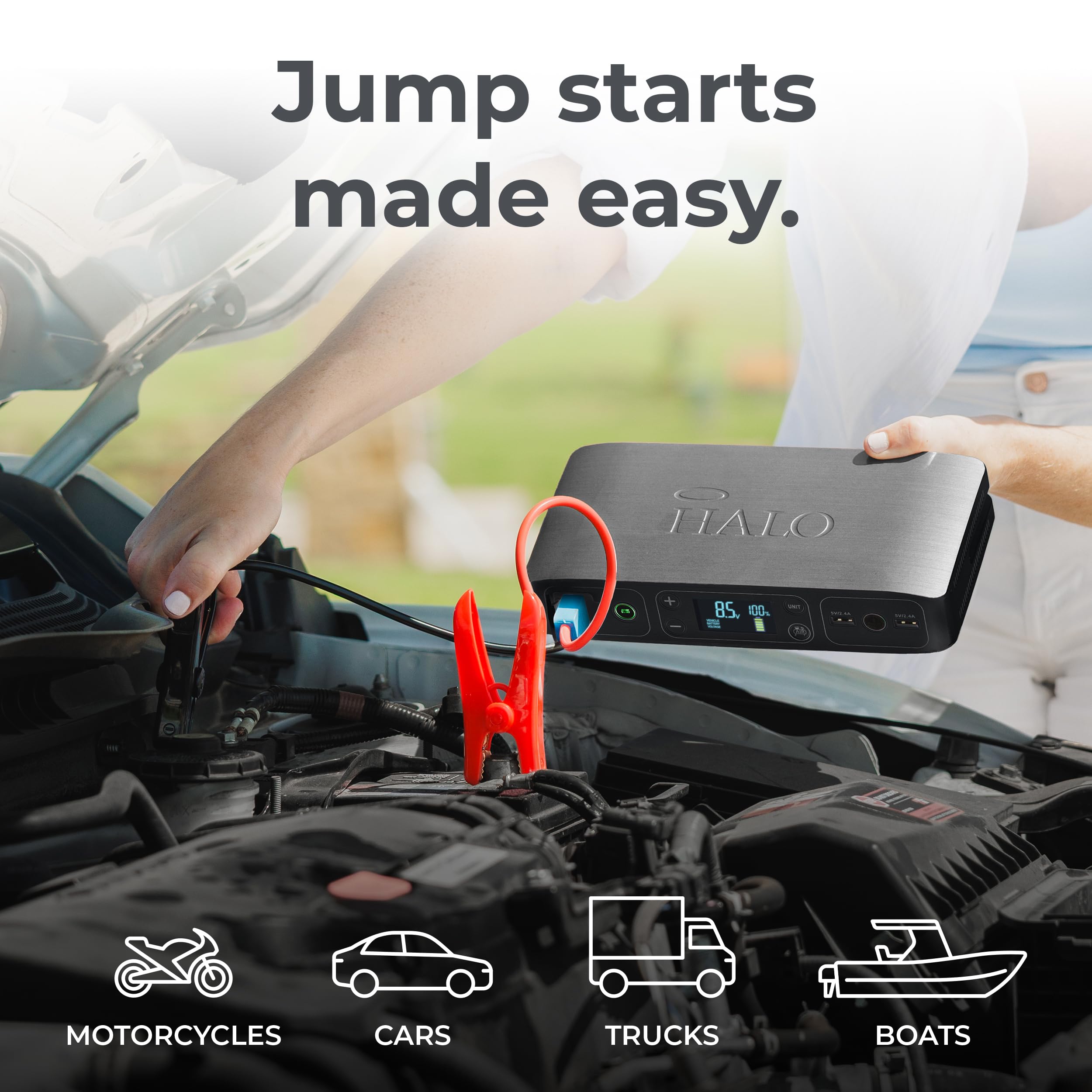 - PORTABLE EMERGENCY CAR JUMP STARTER: The HALO Bolt Air USB Power Bank can jump start a full-sized car or SUV. Everything you need to get back on the road in minutes is included. Model Number: HALO Bolt Air