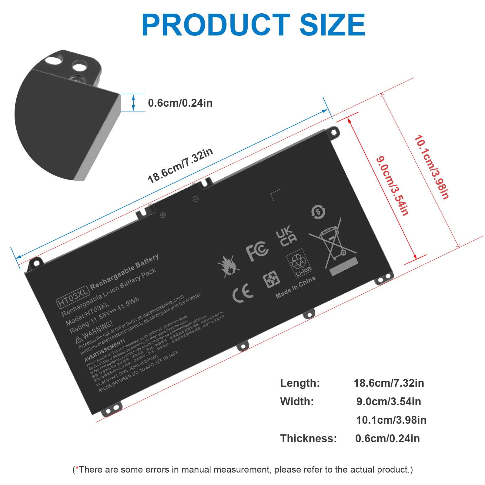 - Battery Model: HT03XL ,Battery Type: Polymer. Voltage: 11.55V Capacity: 41.9WH ; Cells: 3-cell; Color: Black, Packages includes: 1x HT03XL battery ,with two auxiliary installation tool and user manual;ht03xl for l11119-855 hp battery,for hp spare l11119-855 battery,for hp pavilion 15 battery replacement