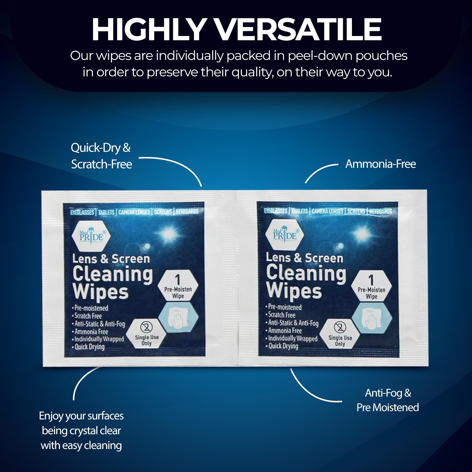 - FRESHNESS GUARANTEED: Savor the freshness of each individually wrapped eyeglass cleaner wipes from MED PRIDE. Each lens cleaner for eyeglasses is carefully wrapped to preserve its quality and ensure it arrives in pristine condition.