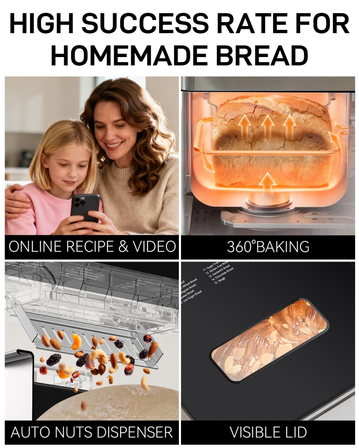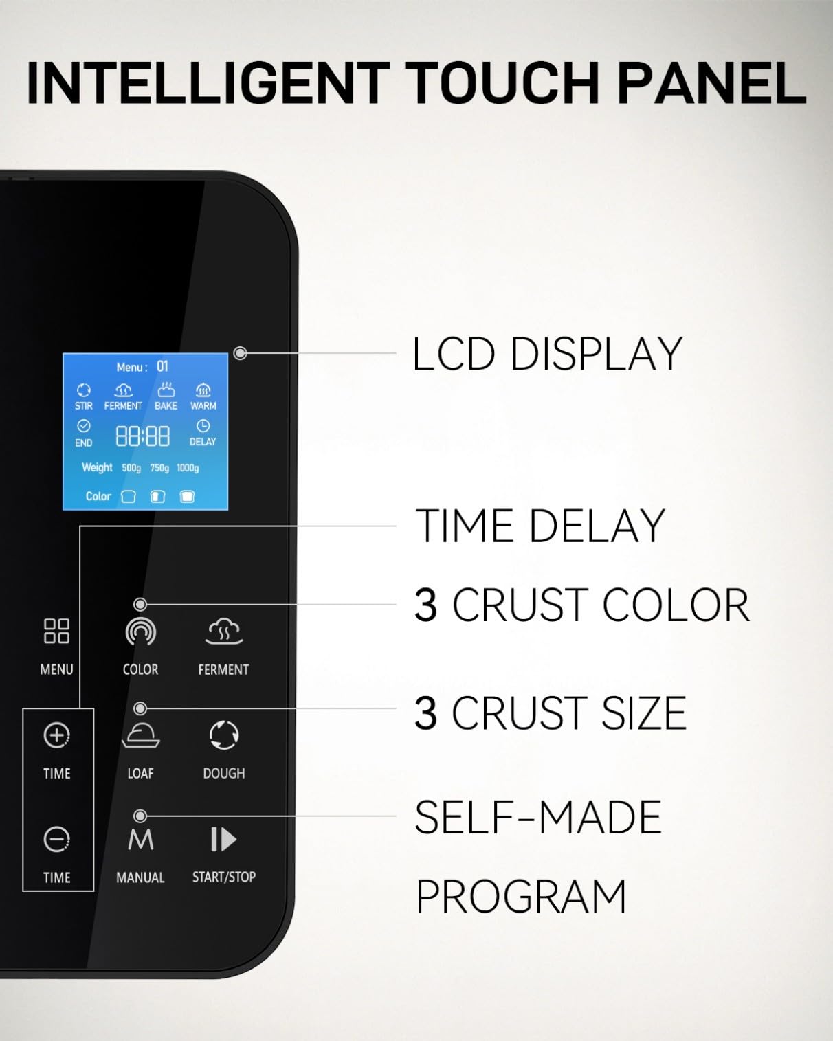 - Touchscreen Display & Visible Lid: This bread machine features an intuitive touchscreen for one-touch program selection—just add ingredients and press start. Its transparent lid lets you monitor the baking process in real time, enabling adjustments for perfect results.