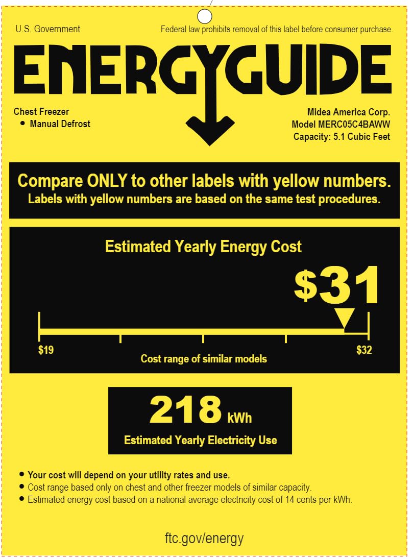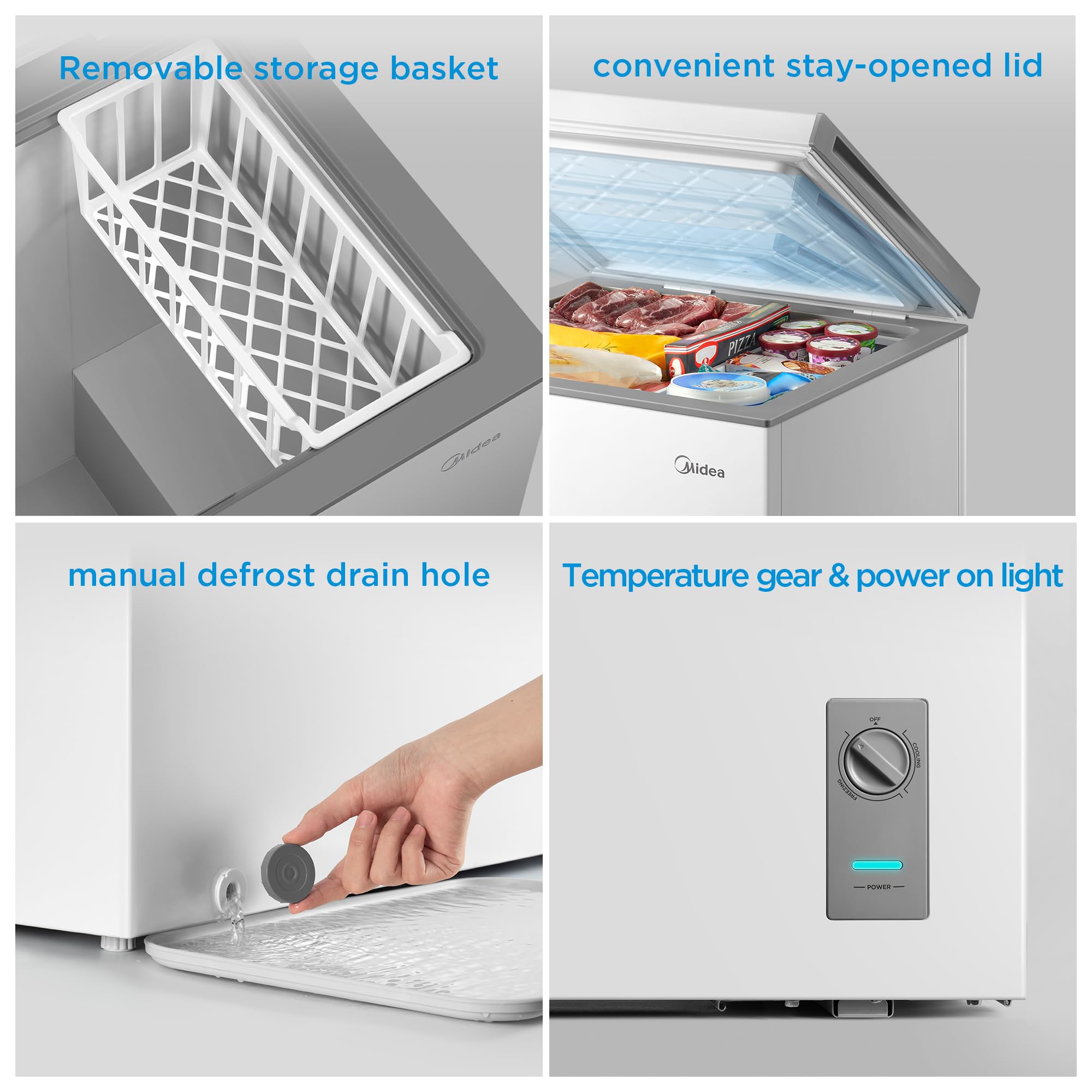 Details: Midea 5.1 cubic feet chest freezer is an excellent choice for holding your favorite food such as meats and ice-cream for long term storage.