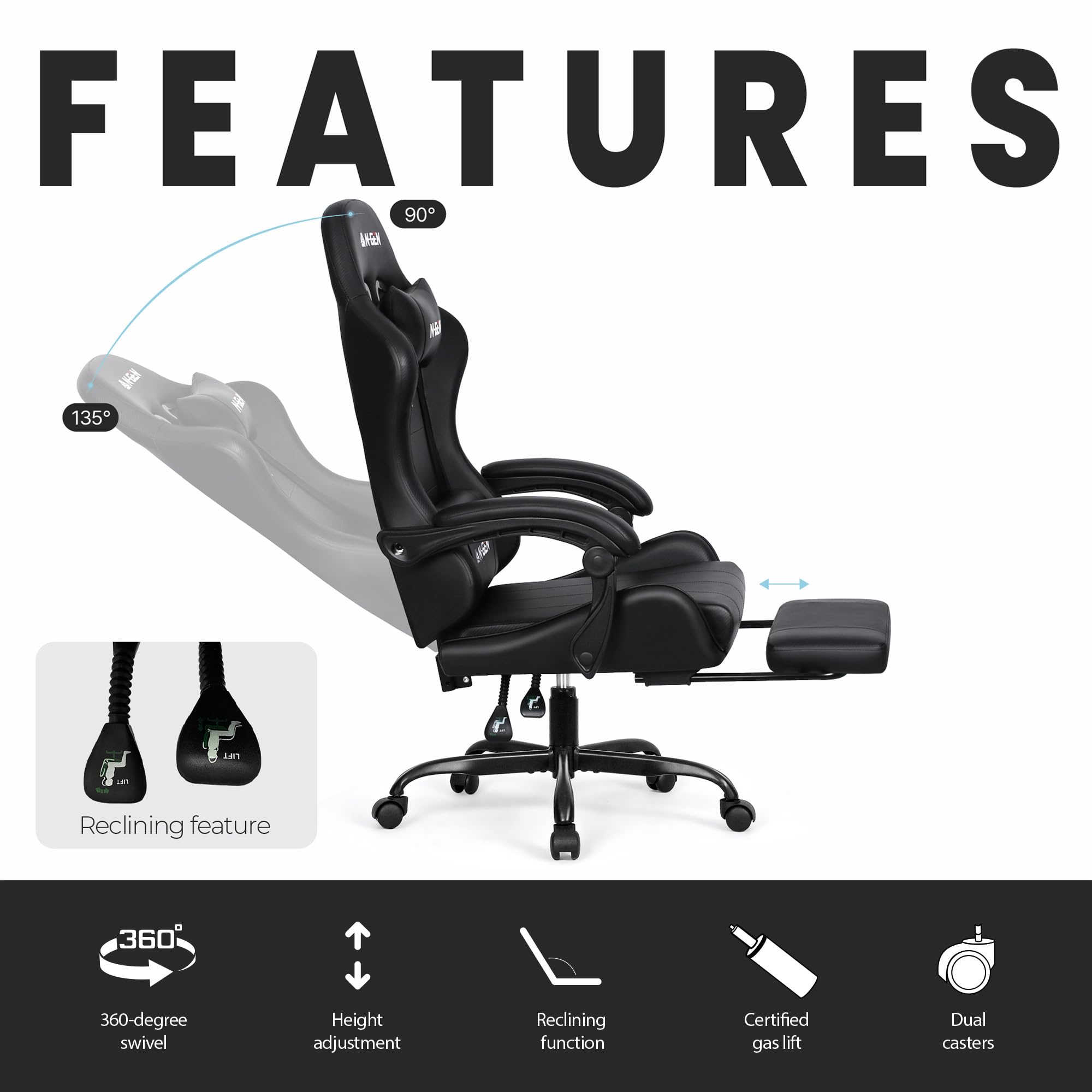 - Adjustable Comfort – Recline with linkage armrests, fine-tune height using an SGS-certified gas lift that supports up to 300 lbs, and rotate easily with 360° swivel and smooth-rolling wheels.
