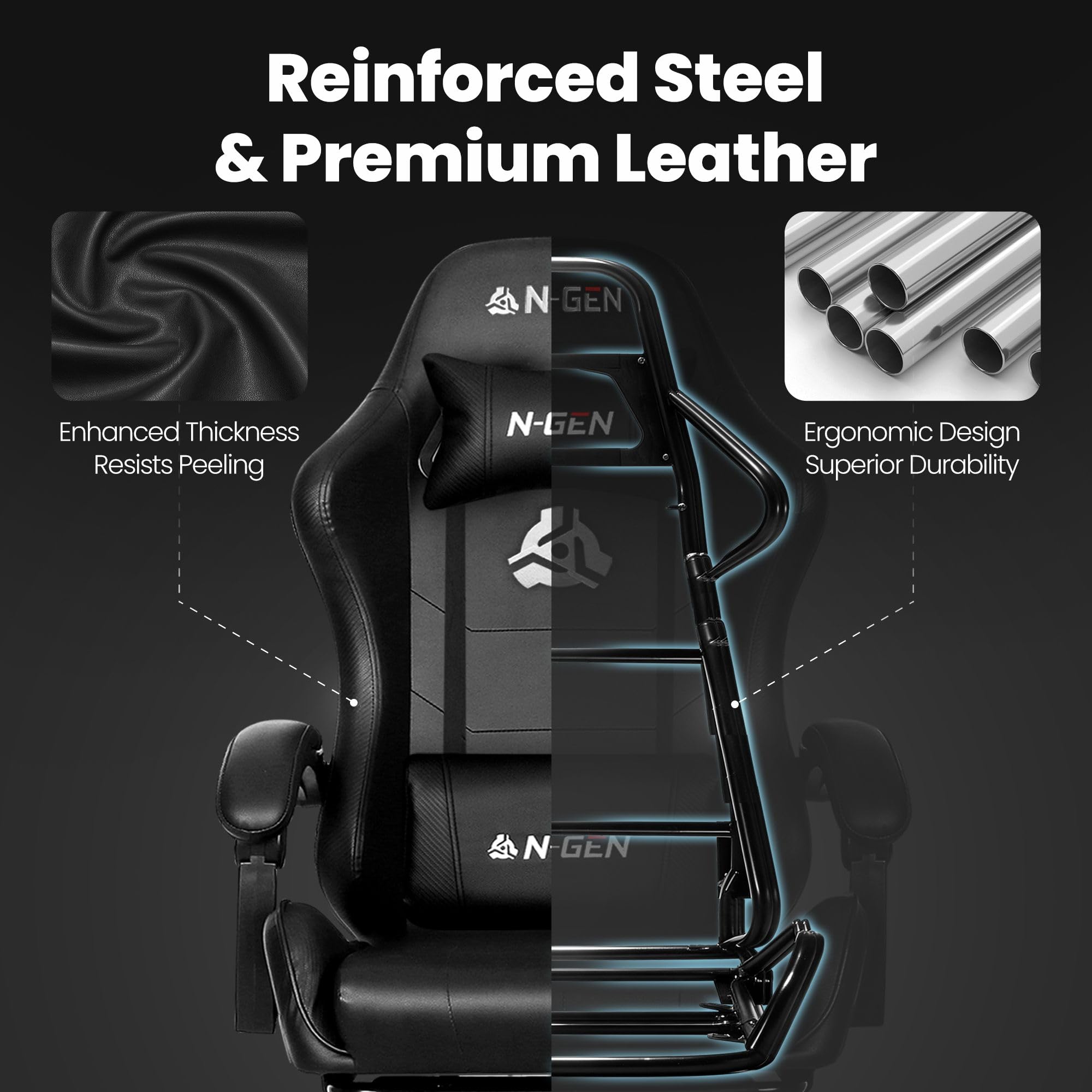 N-GEN GAMING Video Gaming Chair with Footrest Lumbar Support for Home Office High Back Recliner Height Adjustable Ergonomic Comfy Leather Computer Desk Chair (Black)