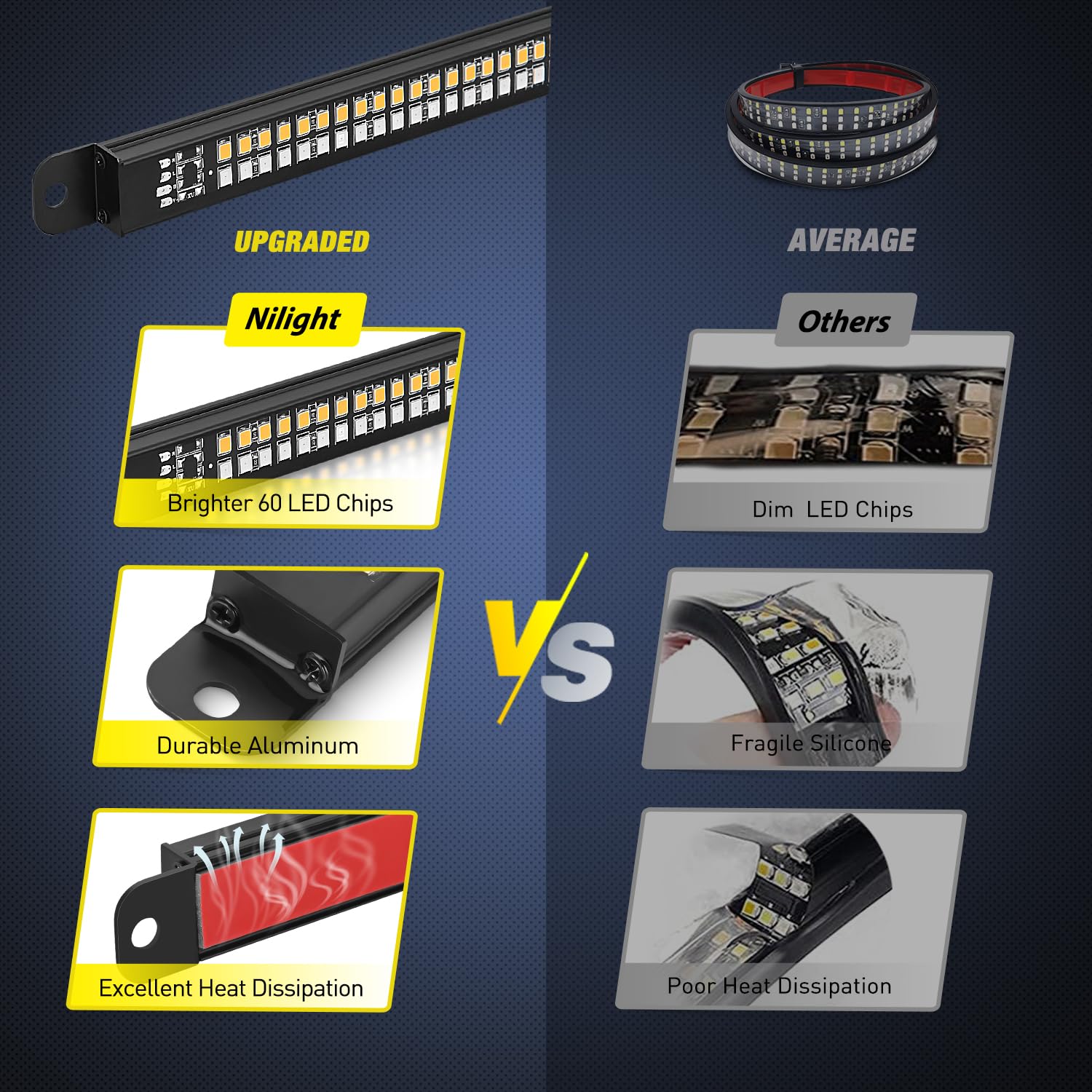 • Waterproof & Durable: Different from the PVC light strip, this aluminum frame tailgate light adopts IP67 epoxy waterproof technology, which has the characteristics of water resistance, chemical corrosion resistance and crystal clear, resist any harsh weather and environment. Outlasts with a lifespan over 50, 000 hours