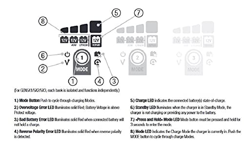- CHARGING MODES — Selectable modes for each bank: 12V, 12V AGM, 12V Lithium, and 12V Repair Mode. Independently charge and maintain all types of lead-acid and lithium-ion batteries with precision.