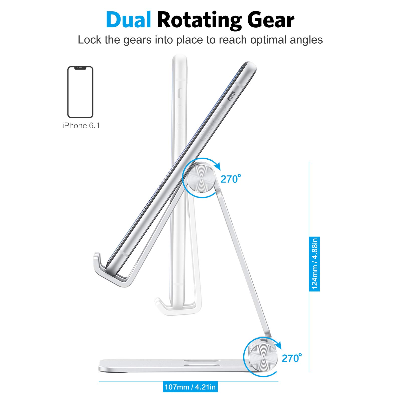 - ADJUSTABLE ANGLE: The cell phone stand can be easily adjusted up to 270 degrees to provide the most comfortable viewing angle while you are watching videos, playing games, making phone calls, viewing recipes or talking on Facetime, etc.It’s also pretty desk accessories in somewhere like office, bedroom etc.