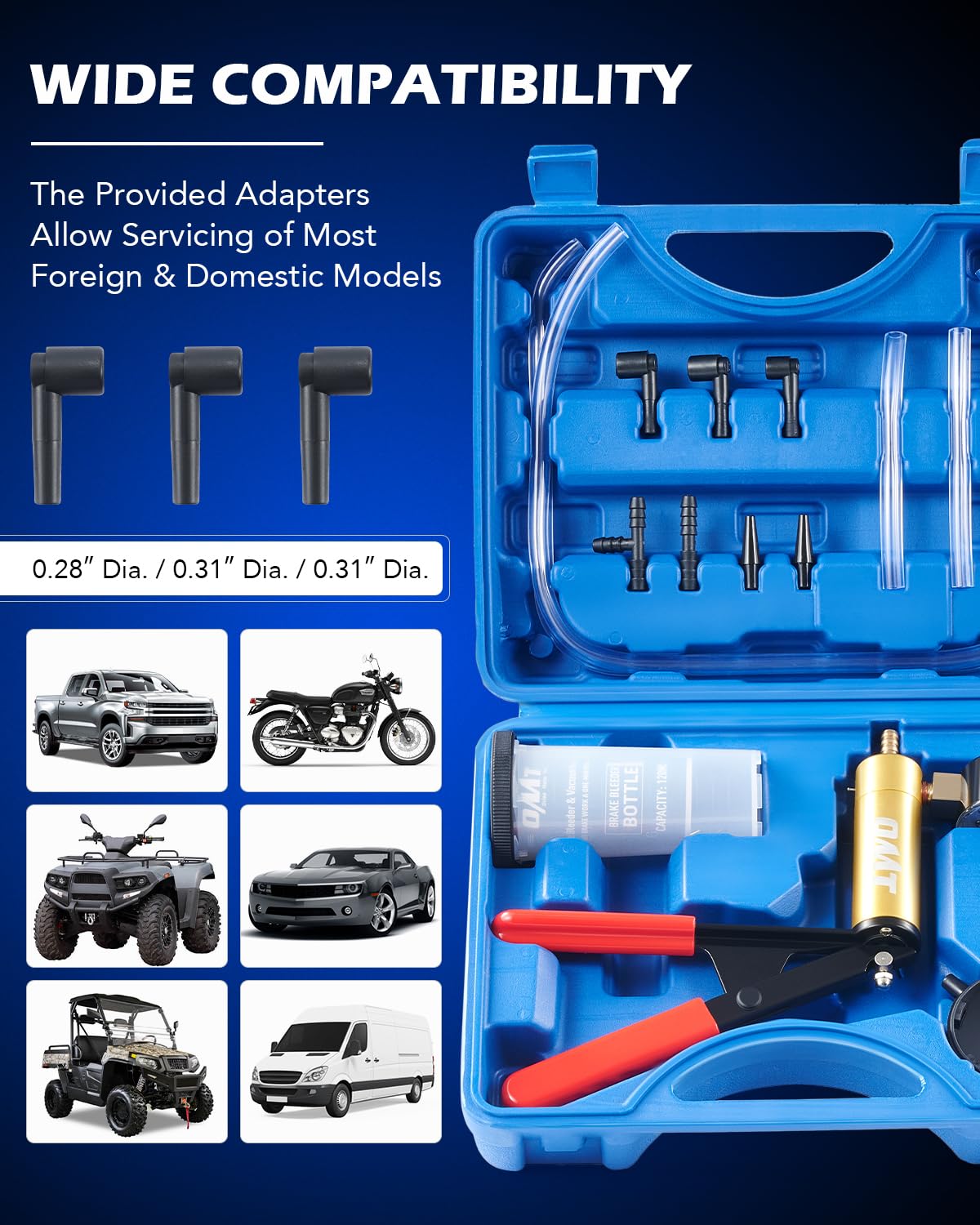 - YOUR TRIP COMPANION: With Orion Motor Tech’s brake bleeder kit, say goodbye to the old days when it takes two or more to bleed brakes and pump out fluids; thanks to the well-designed handheld vacuum pump and clear instructions, brake bleeding of each wheel only takes one less than 5 minutes with great ease