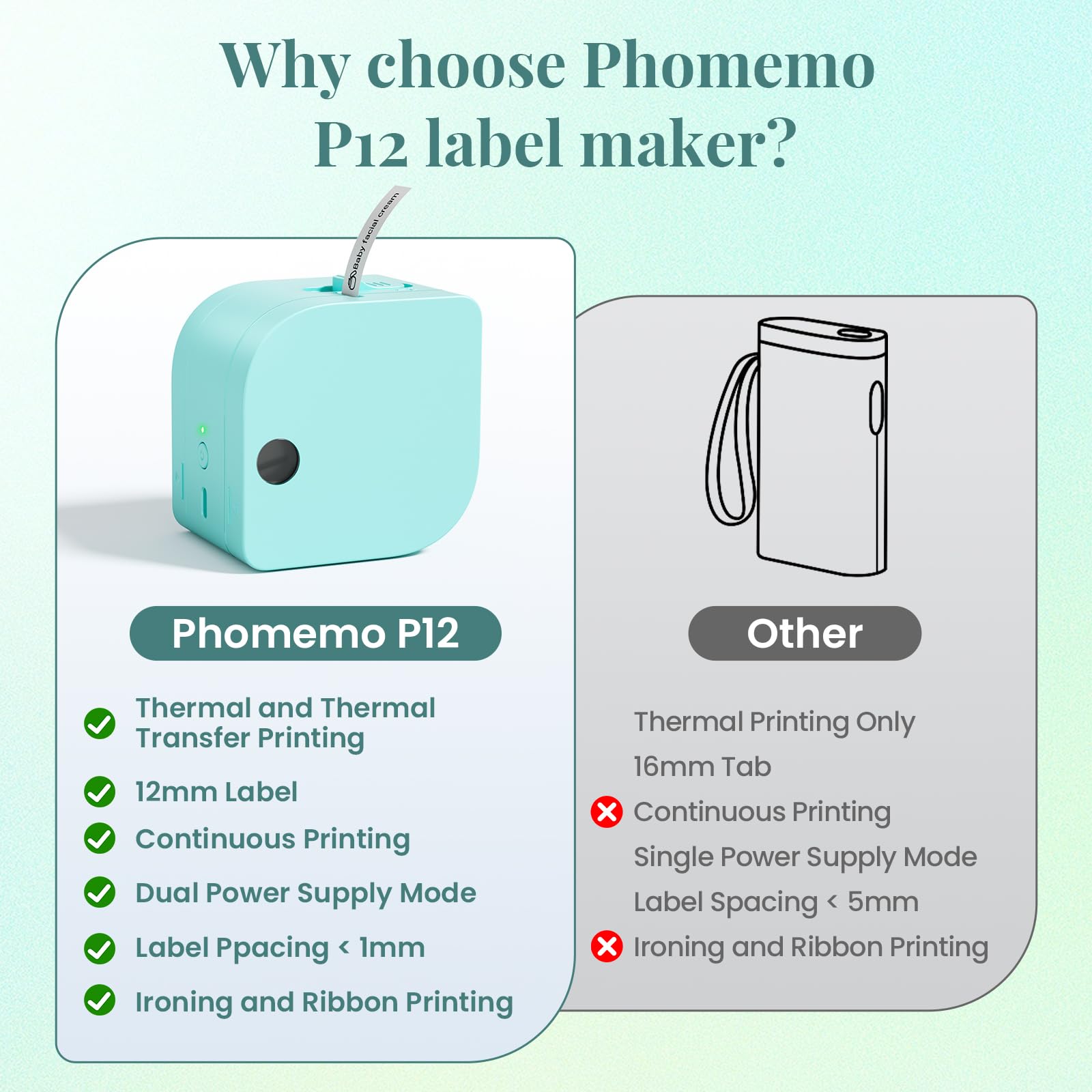 - P12 Label Makers: Portable label maker, newly upgraded thermal and thermal transfer printing technology, can not only meet the needs of home storage labels, but also meet the needs of outdoor, ironing labels, ribbon labels, etc. Compact design, fist-sized, does not take up storage space, portable and easy to use, can be put in your pocket, print anytime, anywhere