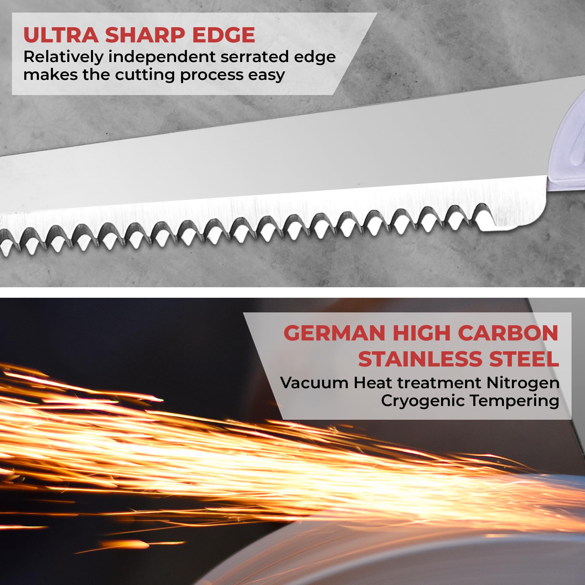 - Enhanced Cutting Ability: 6.69″ Vacuum Heat treatment & Relatively independent serrated edge Blades make the cutting process easy. From brisket to turkey, it carves without tearing up the meat. Friendly Reminder: Not For Slim Slices