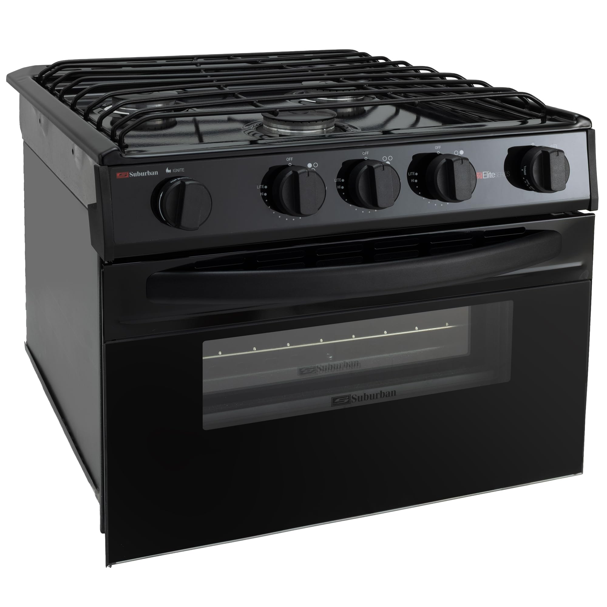 RecPro Suburban RV 17″ Black 3 Burner Propane Range with Gas Oven | 9000 BTU Front Burner | Dual 6500 BTU Rear Burners | Piezo Ignition | Compact Built-In Range for RVs and Campers