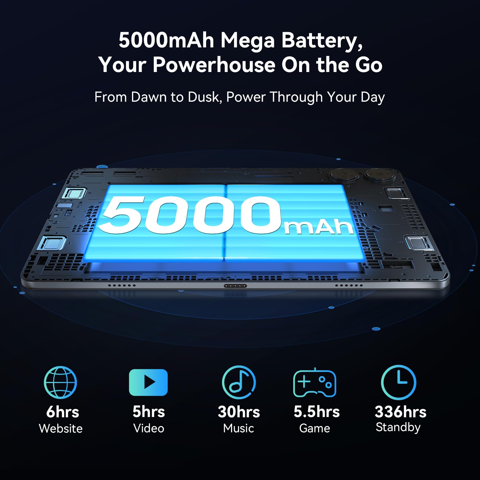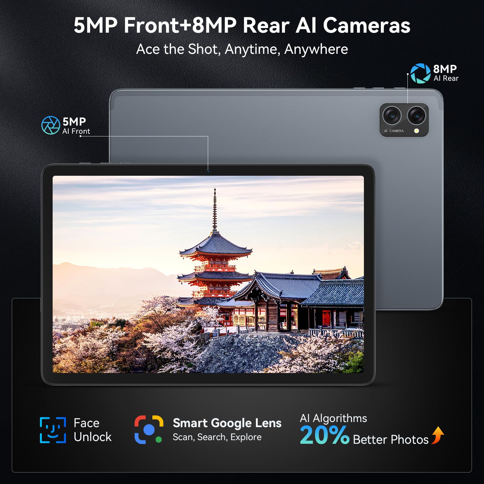 - [ 8MP + 5MP AI Camera & 5G WiFi & BT5.0] Dual-band 5G WiFi boosts speeds by 30% and seamless wireless connectivity via Bluetooth 5.0, blending speed and security for seamless access to this Android tablet. The 8MP rear camera captures crisp, detailed shots—perfect for scanning documents, snapping landscapes, or casual photography. A 5MP front camera enhances video calls and selfies with AI-powered optimization, even in low light.