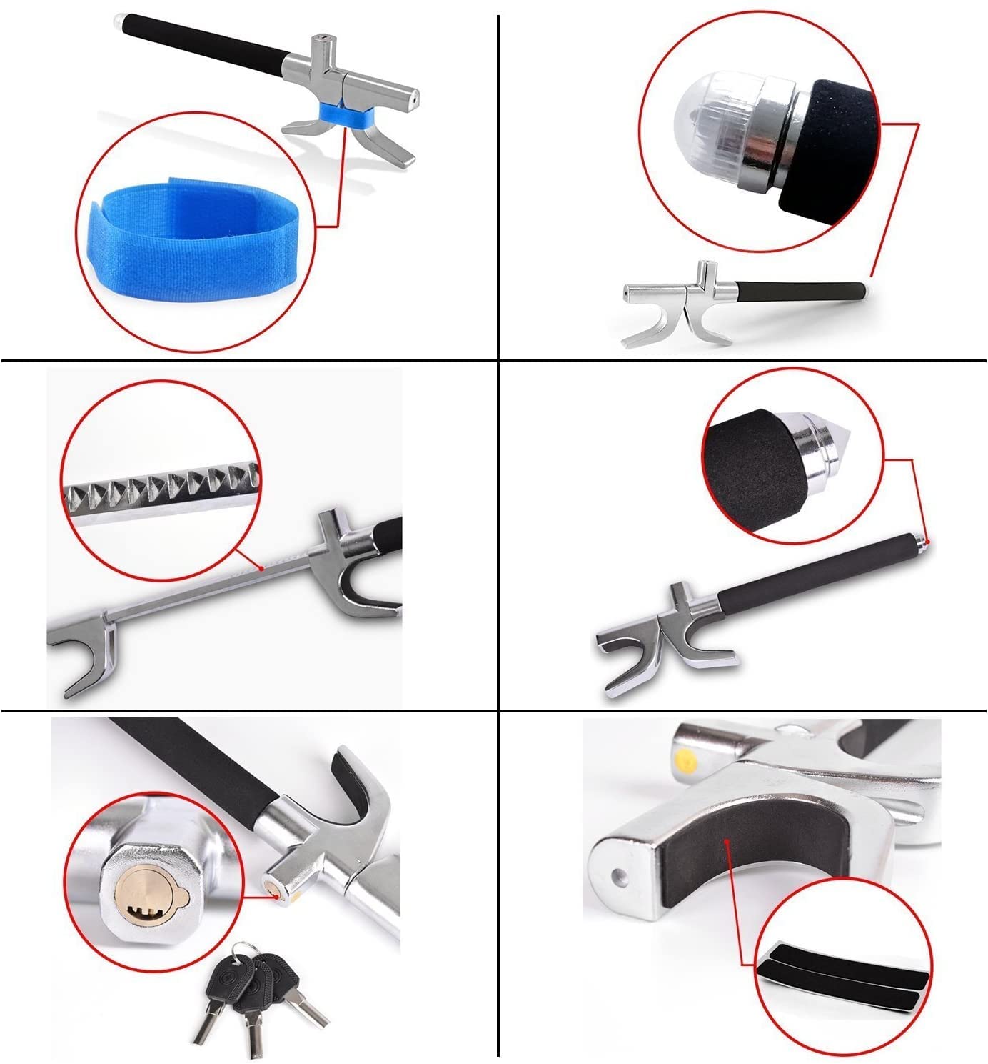 - Tevlaphee Classic Steering Wheel Lock–Better than other competitors! We provide [4 Protective Pads] to you, Others’ NO! Must cause damage or pressure to your steering wheel! We provide [Hammer Cap] to you, Others’ NO! You can’t break the car window or save yourself when emergency happens! We provide [Blue Magic Velcro] to you, Others’ NO! The Lock can’t stored or fixed rightly and scratch to your car! Give Tevlaphee a chance to provide security for you and your car!
