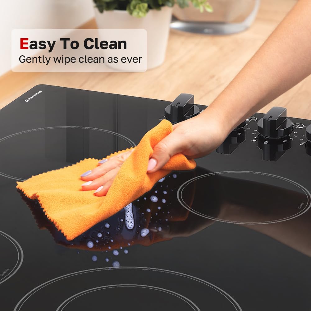 ThermoMate 30 Inch Electric Cooktop 4 Burners ETL Certified, Knob Control Built-in Radiant Electric Stove Top, Schott Glass Panel, 7300W, 9 Heating Level, Chlid Lock & Timer, 240V