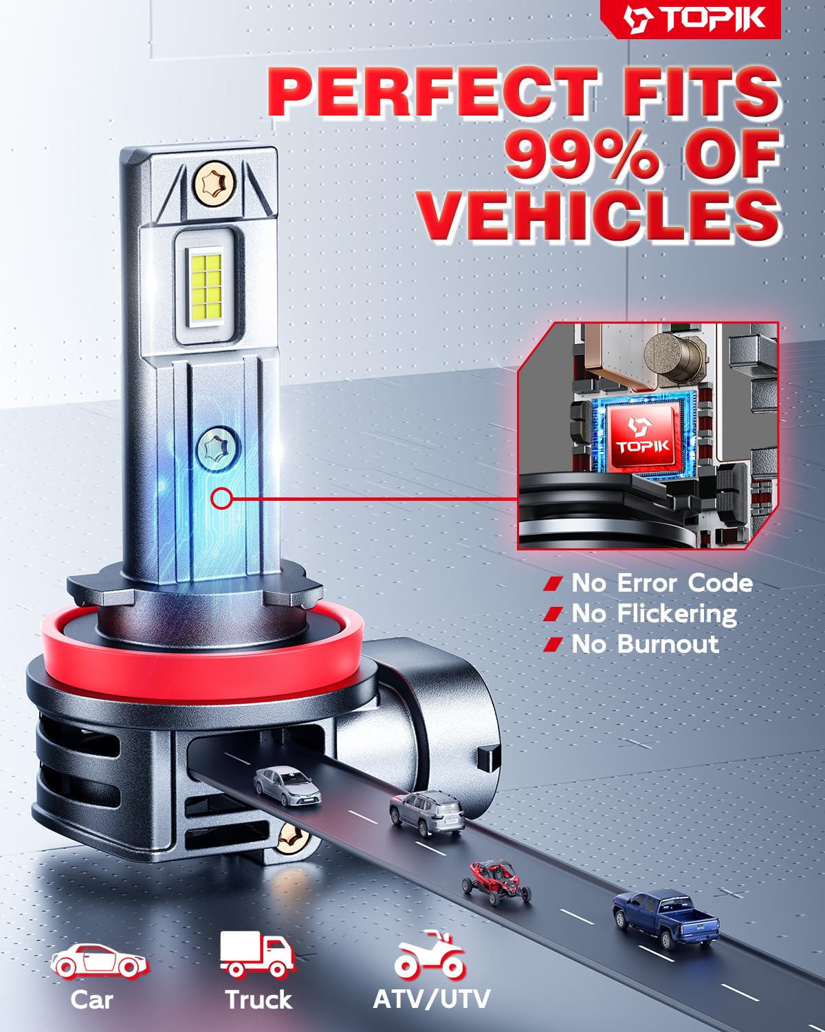 - 【Broad Compatibility】: TOPIK 9005 H11 HB3 H9 H8 bulbs utilize an advanced IC driver that is 99% compatible with a wide range of vehicles, perfectly solving problems such as flickering lights and dashboard warnings, however, for a few sensitive models, a CAN bus decoder may be required to solve any potential problems, please contact us.