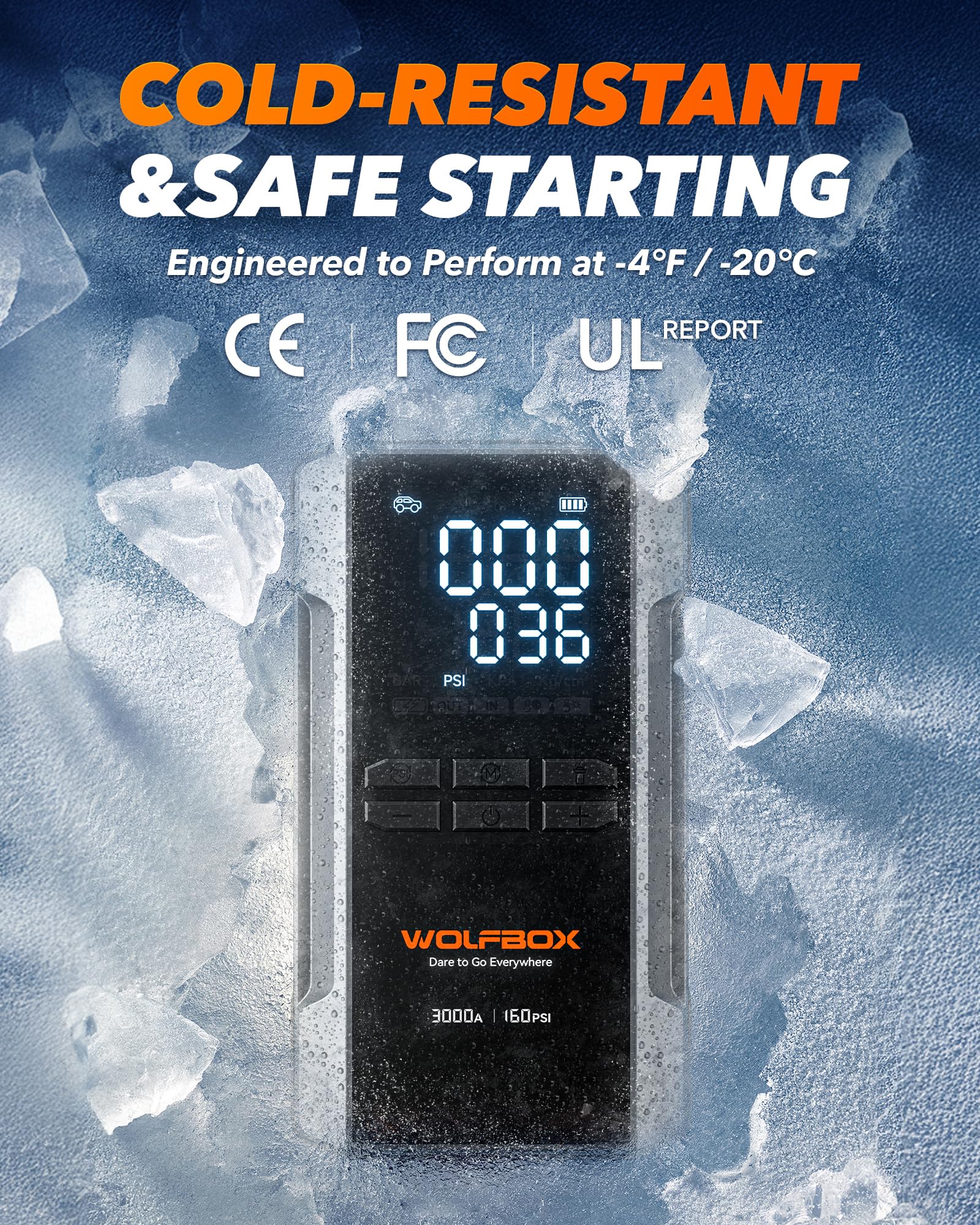 - Operates down to -4°F & 10 Types Protections – The portable battery jump starter with air compressor, rated at IP64 for protection, ensures resilience in harsh environments. Operates at -4°F and survives the cold